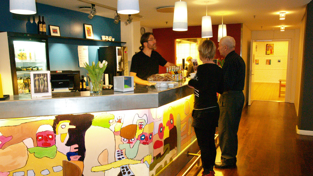 Caféen er udsmykket af outsiderkunstnere, så mad og kunst går op i en sanselig oplevelse. Fra caféen er der adgang til museets udstillinger, hvor der er gratis entre.