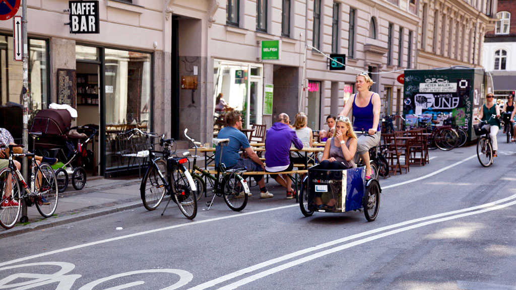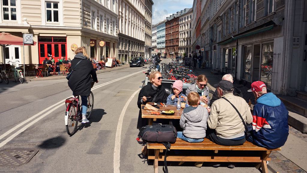 I Elmegade ser du også unge børnefamilier og veninder med barnevogn, som mødes for at få sig en snak og en kop kaffe på Coffee Collective eller ude foran Kaffebar.