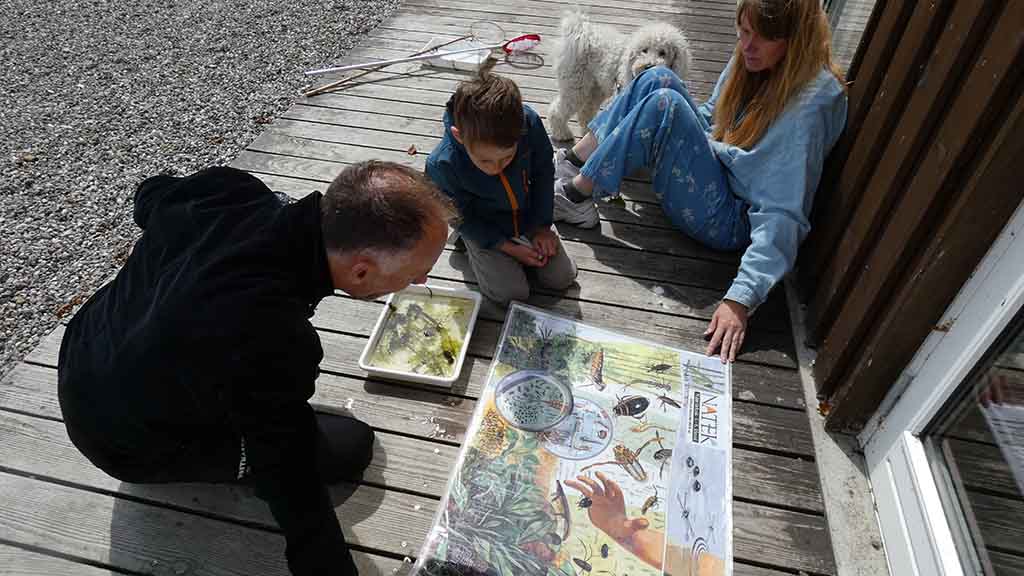 Ved naturrummet er der en grejbank, hvor I gratis kan låne udstyr til at udforske insekterne i området og livet i vandet i den lille sø foran Naturrummet og i det lave vand ved kysten.