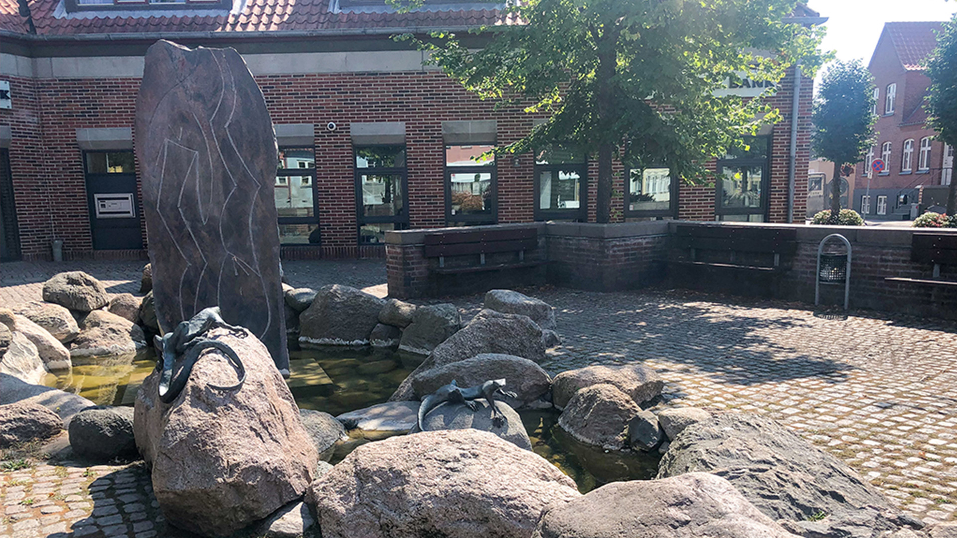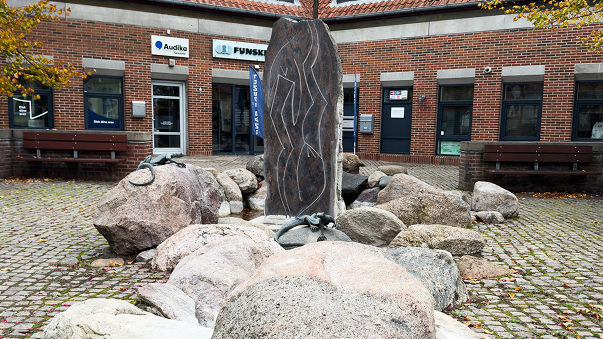Mellem de store sten ses to store kæmpefirben med klør, der ligner lange fingre. Firbenene, der er støbt i bronze, ligner efter sigende de komodovaraner, som den langelandske forfatter Vagn Lundbye mødte på Komodo-øen omkring 1980.