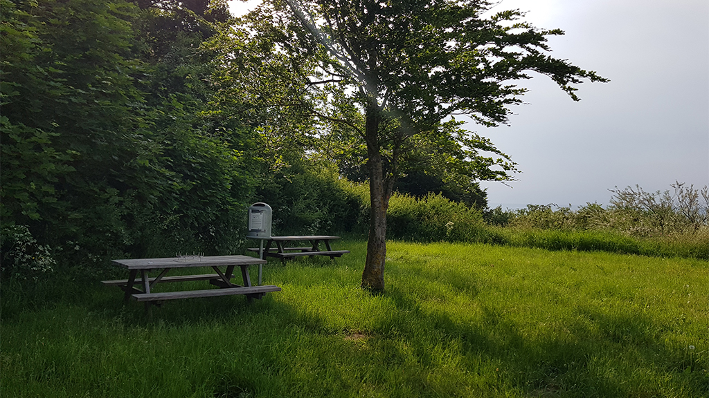 Fra parkeringspladsen kan du vælge at følge det store græsareal mellem sommerhusene og vandkanten. Et par hundrede meter mod syd, kan du tage en sti ned til endnu en strand. Her er der badebro og borde/bænkesæt.