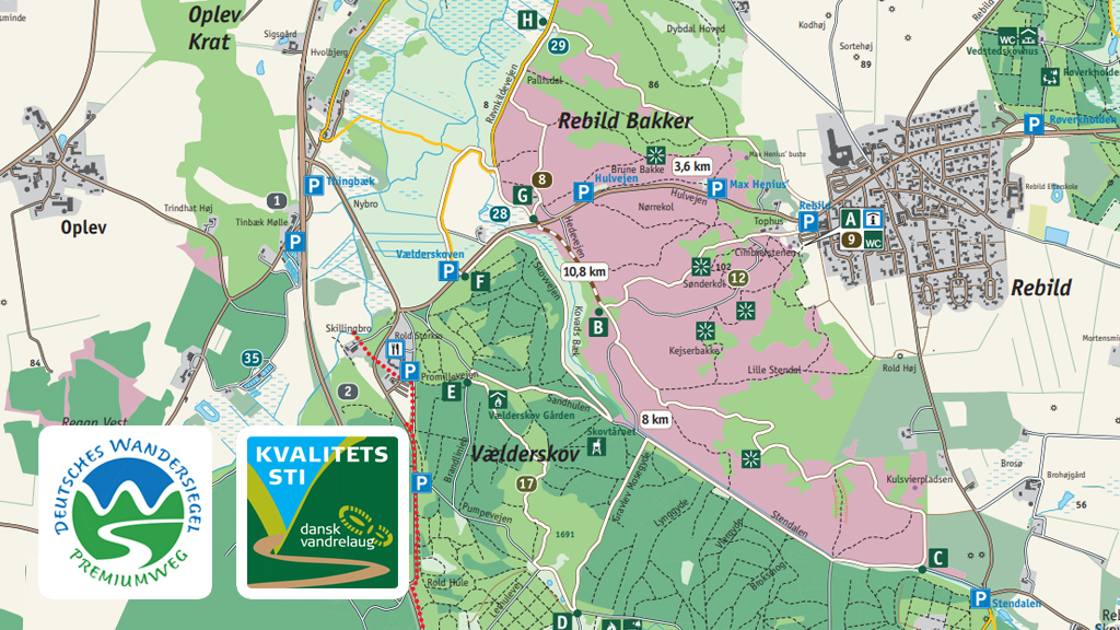 Rebild Bakker Ruten (markeret med hvide pile) er planlagt af Naturstyrelsen Himmerland og Rold Skov Natur- og Kulturcenter, med henblik på at give dig de bedste oplevelser af den smukke og varierede natur i området.