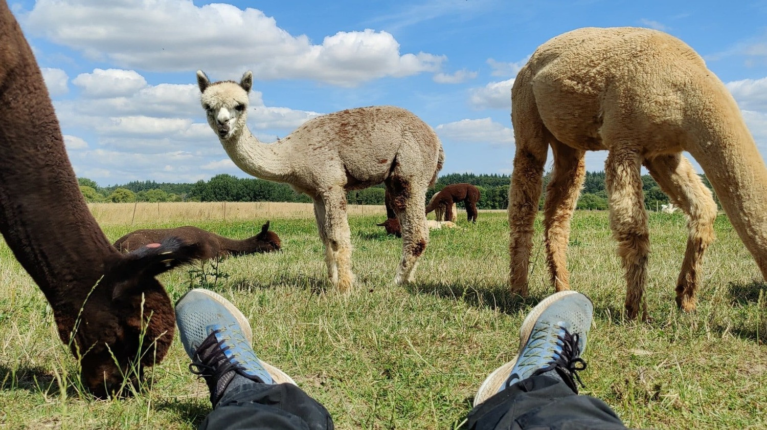 Der er borde og stole til fri afbenyttelse, og du har mulighed for at nyde en ægte picnic-oplevelse midt iblandt alpacaerne – en sjælden og stemningsfuld måde at være tæt på både natur og dyr.