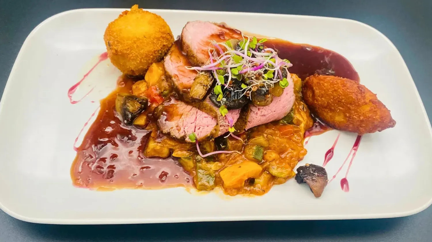 I kan roligt glæde jer til kroens mad, som I indtager i kroens Restaurant Karsten Thomsen, der er opkaldt efter digteren af samme navn. Han var krovært på Frøslev Kro fra 1859 og i årene frem.